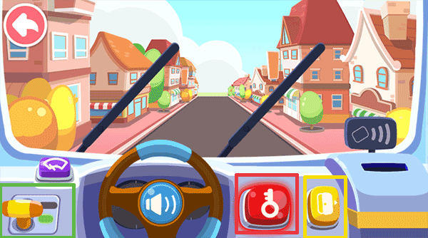 3、进了驾驶模式,大家看下面这张截图。操作很简单,红色框是启动和停车,绿色框是油门加速,黄色的负责开关车门,别搞混了。