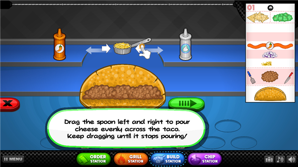11、玩家只需左右滑动,即可撒上配菜,最后,所以配菜上完后,点击绿色方向键。
