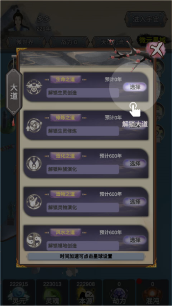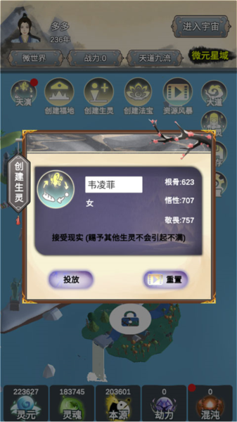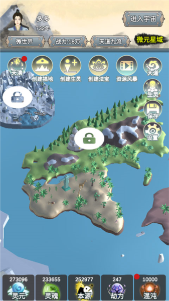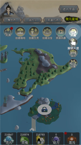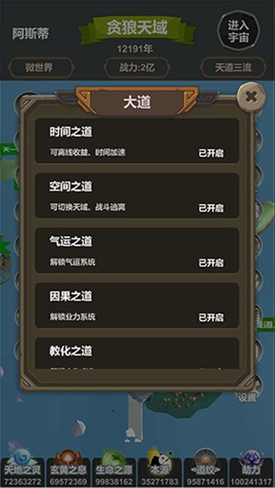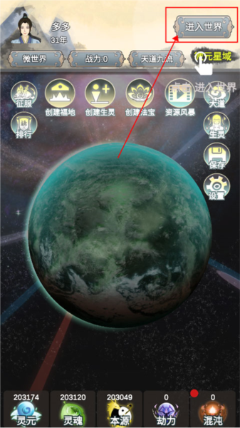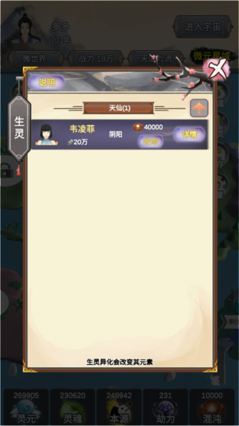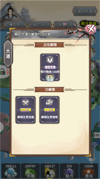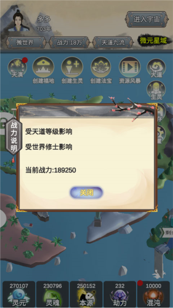 5、这里的“灵元”、“灵魂”、“本源”、“劫力”、“混沌”和“年数”会随着时间自动加成,快开发属于自己的世界吧。