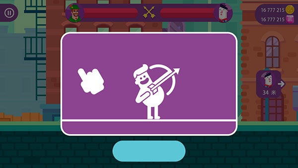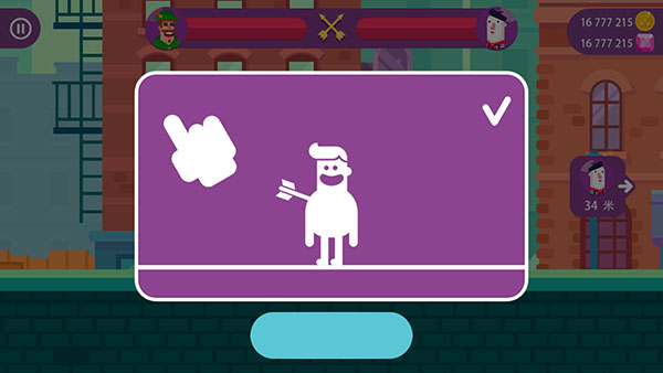 画面表现还算过得去,操作这块就是经典的弹射玩法,玩过愤怒的小鸟的兄弟肯定不陌生。随便按住屏幕上你角色旁边的地方,往后一拖,就能看到力度条和角度线。手一松,武器就飞出去了。讲真,这套操作上手没任何难度,系统还贴心地给你标好了力度和角度的参考,对新手来说算是相当友好了,能帮你更快找到手感。