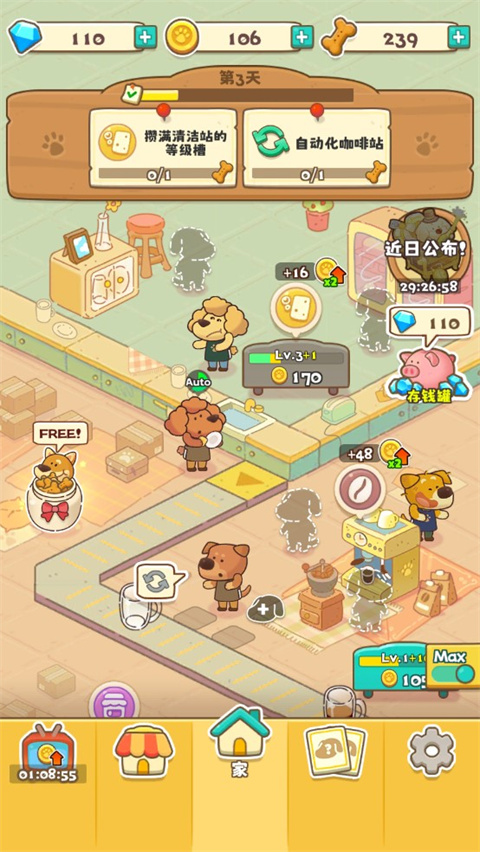 《小狗咖啡馆》是一款轻松治愈的挂机经营类游戏,玩家将经营一家由可爱狗狗担任店员的特色咖啡馆。整体画风温馨可爱,角色设计充满个性,带来轻松愉快的游戏体验。游戏玩法以经营与养成为核心,通过点击操作完成制作与经营,逐步解锁自动化系统,提升效率。前期需要一定的手动操作,随着进度推进可实现挂机收益,减轻操作负担。在经营过程中,玩家可以通过收益扩展店铺规模,并自由装饰咖啡馆,打造个性化空间。同时,不同狗狗店员的互动与表现,也为游戏增添了趣味性与治愈感。整体来看,该游戏节奏轻松,玩法简单,适合在碎片时间体验,是一款偏休闲放松类型的模拟经营作品。