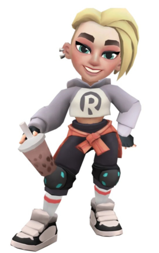 这姑娘叫Catrine,地铁城来的,一头金发,青色的眼睛。穿了件紫色的短款连帽衫,胸口有个R字母。下身是深紫色的运动裤,带护膝的那种,手上还有个无指手套,跟杰克某套皮肤有点像。袜子是灰橙条纹的,配了双灰黑运动鞋。