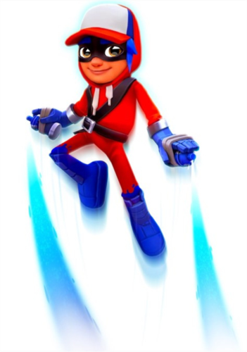 杰克这身“超级跑者”行头包括一件红色连帽衫,棒球帽上没有了地铁跑酷的logo,戴着黑色的多米诺面具,身上还有安全带。手套和靴子都是蓝色的,连头发和眉毛都染成了蓝色。手里还拿着两个喷漆罐,一看就是老本行。