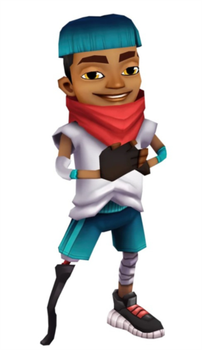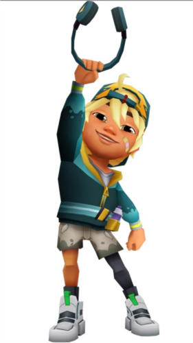 这小伙是个法国街头艺术家,皮肤挺白,眼睛是淡褐色的。一头乱糟糟的金发,戴了顶绿松石色的帽子,上面还有金色装饰。外套是绿松石、水绿和金色的拼接款,里面是白T恤。裤子是浅棕色短裤,上面有灰色斑点。腰带是浅蓝色的,还插着几个喷漆罐。他左腿穿了黑色长袜,右腿却是同色的短袜,挺个性的。鞋是白色的,配黑色鞋带和绿色鞋舌。戴着灰黄色的耳机,左边脸颊上还贴了个创可贴。