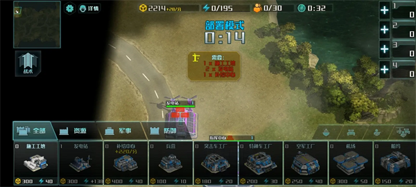 可建造的建筑及数量限制:施工工地(3)、突击车工厂(3)、特种车工厂(3)、空军工厂(3)、机场(2)、船坞(3)、基础防御塔(4)、炮塔(3)、防空塔(6)、海上防御塔(4)。