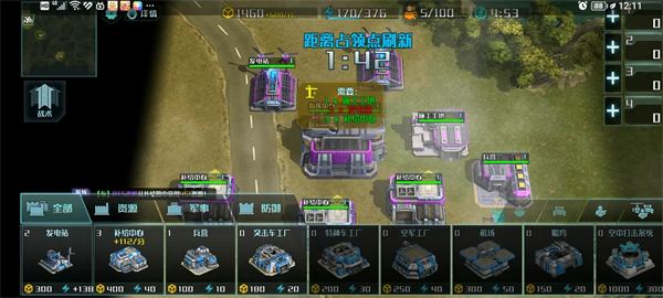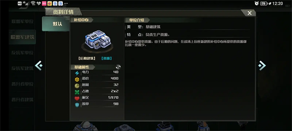 所有建筑的护甲都是Ill级,游戏里叫重型装甲。补给点我后面就直接说“钱”或者“资源”,电力就说“电”,耐久就叫“血”,这样好懂。