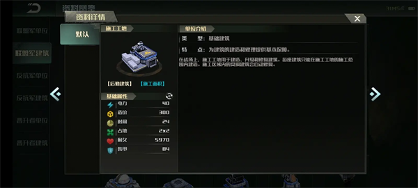 建造该建筑需要消耗40电力与300资源,耗时24秒;其占地面积为2x2,且周边2x4范围内无法建造。