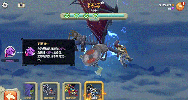 维的皮肤就更偏向保命了,说白了就是为了让你活得久一点,更容易刷高分。基础速度直接加30%,总算能跟上大部队了,不再是爬行生物;血量加25%,直接飙到875,比另外两条龙高出一大截;还能免费原地复活一次,等于自带了个宠物安杰利科,多条命心里总归踏实点。