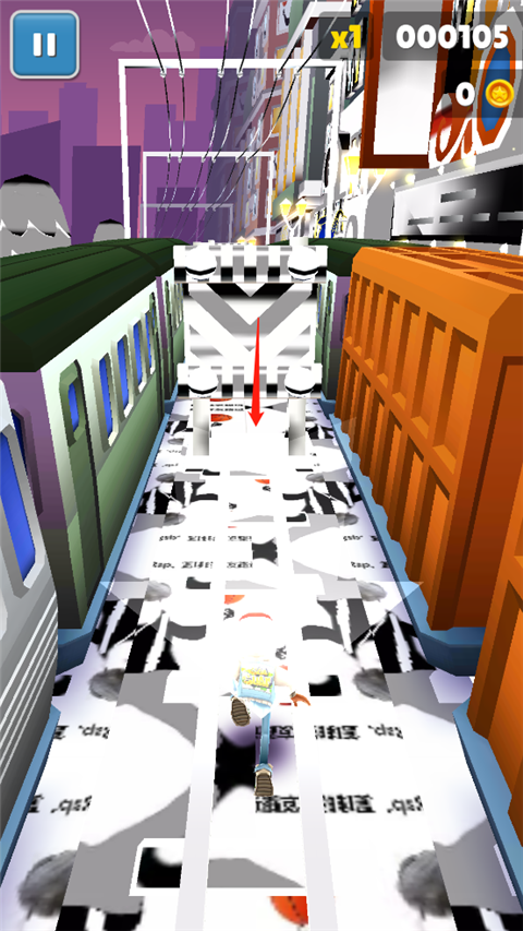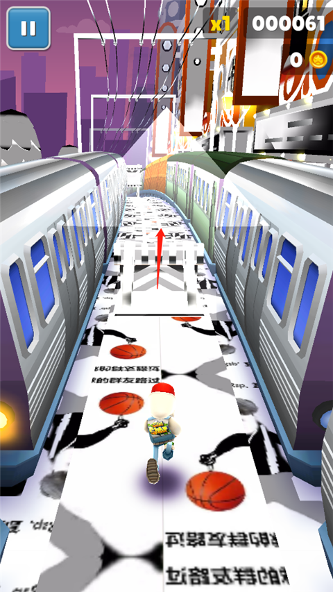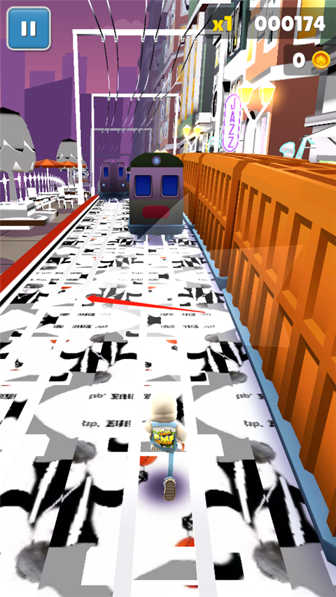 4、路上有障碍物,往上划就能跳过去。注意,这些障碍物是有实体的,意思是你还能踩着它来个二段跳,利用这点能跳上火车顶,不过这得练。就像下面这张图里的情况,直接往上跳就对了。