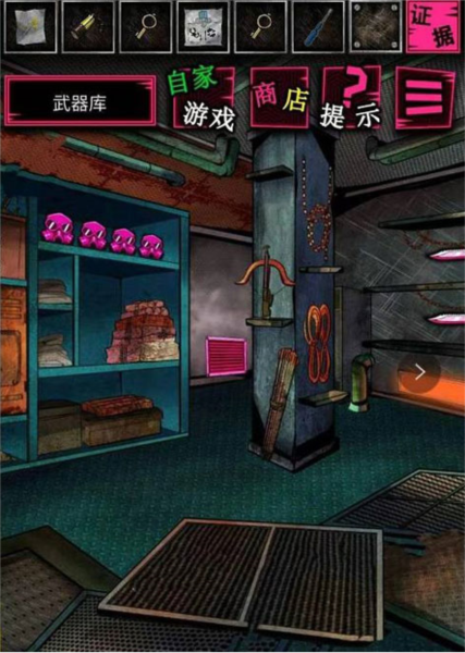 随后前往二楼武器库,点击架子上的刀具,即可获得【武器库内的野战刀】和【看守武器库的人】作为证据。。