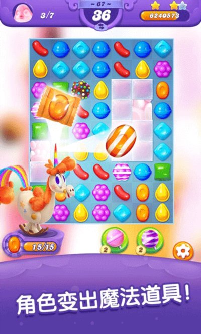 着色糖果:把它和旁边的糖果交换,场上所有那个颜色的糖果都会被染成着色糖果的颜色。如果颜色本来就一样,它会随机染成别的色。