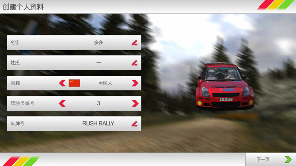 1、启动拉什拉力赛3最新版,第一件事是创建自己的档案,填个昵称、选个国籍之类的。