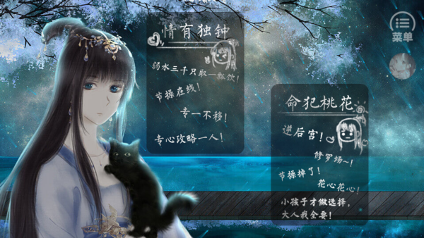 刚下载好游戏,直接点“开启旅途”就完事了!开场动画和剧情直接给你怼脸上。开整之前,系统会让你选路线,是当个痴情种一心一意,还是当个海王我全都要?故事发生在一个遍地是妖的乱世,主角一脸懵逼地穿越过来,身上还有些怪里怪气的图案,没辙,只能跟着主线走了。