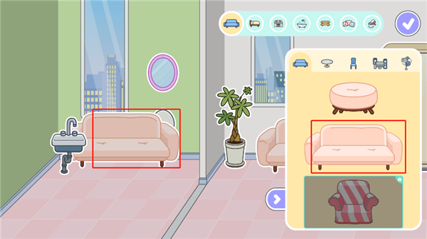 4、点开之后, 里面给你准备了巨量的家居用品, 什么沙发、桌子、洗手台、床、浴缸, 品类齐全得很。你就跟逛宜家似的, 随便挑你喜欢的。