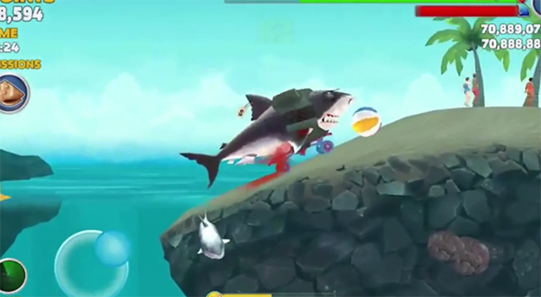 玩家控制鲨鱼进入海中猎食,根据鲨鱼的型号会限制玩家可以猎食的对象,鲨鱼的生命值会不断下降,所以玩家只能让持续猎食。