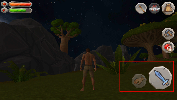 5.捡东西的功能,只有你人靠近了能捡的玩意儿之后,那个拾取键才会亮起来,长按就能捡。旁边那个剑的图标,就是攻击或者防御的按钮了。