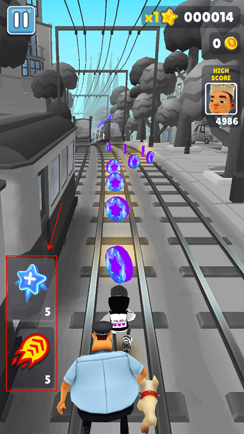 5、不同的障碍物需要用不同的动作来躲。比如看到火车冲你脸上了,赶紧往旁边跳开,撞上去直接就没了。游戏里也能用道具辅助,开局的时候,左边会有加速选项,只要你有加速道具,点一下就能让你的人物瞬间起飞。