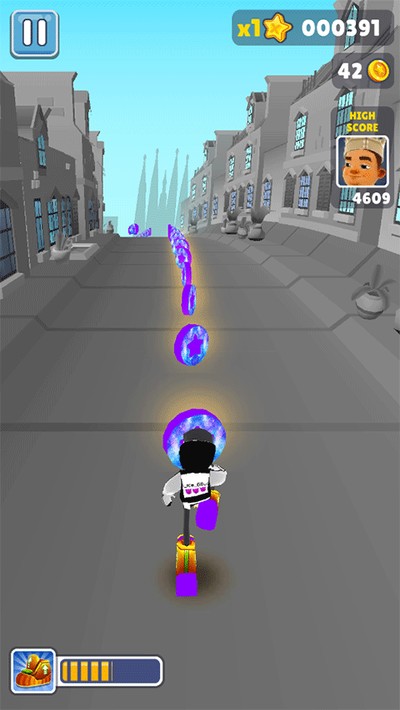 3、路上能捡到的道具有这么几种:火箭背包能让你飞起来,无视所有障碍顺便吸一串金币;超级跑鞋能让你跑得飞快;金币磁铁就是个吸尘器,自动帮你吸周围的金币;双倍积分就是让你在一段时间内得分翻倍。记住,这些玩意儿都有时间限制,得看准时机用。