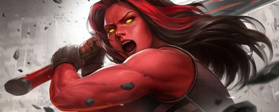 她全名叫伊丽莎白·塔尔博特·罗斯-班纳,是红巨人罗斯将军的闺女,也是绿巨人布鲁斯·班纳的老婆。她被恶型怪给弄死了,后来又以女红浩克的身份复活了。她能吸收各种形态的辐射能量,还能把自己的愤怒转化成超人的力量。