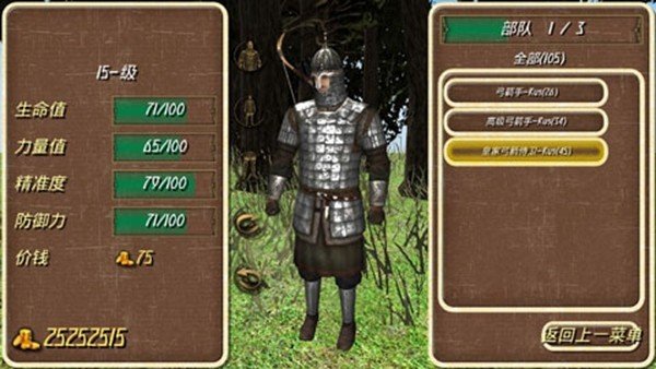 4、士兵分三个等级:新手、大师级、精英。招募时等级越高,花的钱就越多,这很合理。招来的兵可以通过打仗或者花钱请教练来升级,不过升级的时候还得再掏一笔钱,不然就算经验满了也升不上去。你自己的角色也有等级,开局1级给9个属性点,自己看着加。属性有力量、生命、命中、领导能力、防御这五项。打仗就能升级,每升一级又给9点,满级30级。下面再聊聊战斗系统。