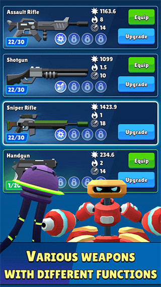 3、遇到打不过的敌人可以选择对武器进行升级,提高武器的伤害和射速;