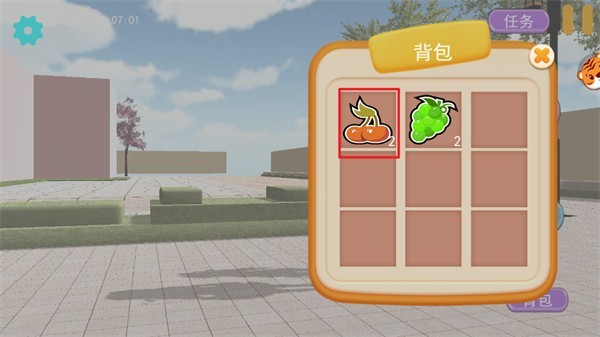 6、 打开背包后,里面的物品一目了然。比如,你可能会发现自己有几串樱桃和葡萄。好奇这些水果有什么用?试着点击一下樱桃的图标看看。