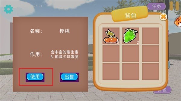 7、 点击之后,关于樱桃的详细信息就会弹出来。原来它可以用来补充体力呢!当你觉得有点累的时候,就点击【使用】按钮,让角色吃下它,瞬间恢复活力。