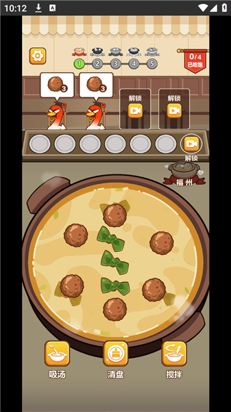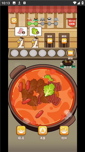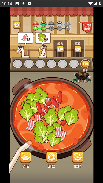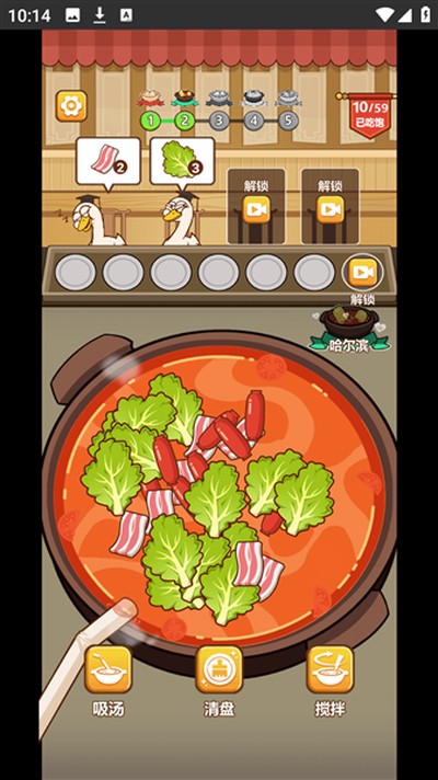 5、要是发现锅里的食材排列组合不太对,没法满足顾客的需求,可以试试点一下右下角的搅拌功能,打乱一下顺序。
