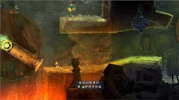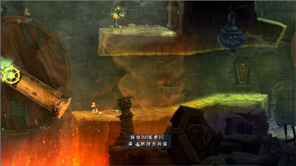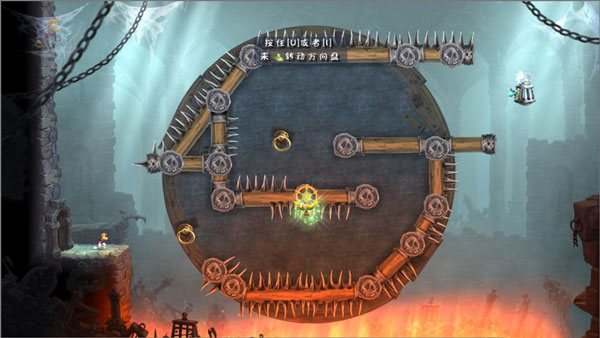 6、这地方稍微复杂点。先跳到铁环上,然后转动机关圆盘,等自己被甩到最高点再松手,抓住中间那个环。接着再把圆盘转到水平位置,就能跳出去救人了。