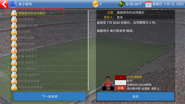 5、最后去你的收件箱里看看,要是球员那边接受了你的报价,这人就归你了。