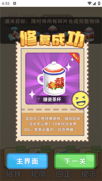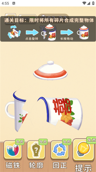 1、通过点击、拖动与旋转碎片,将破损物品逐步拼接复原。