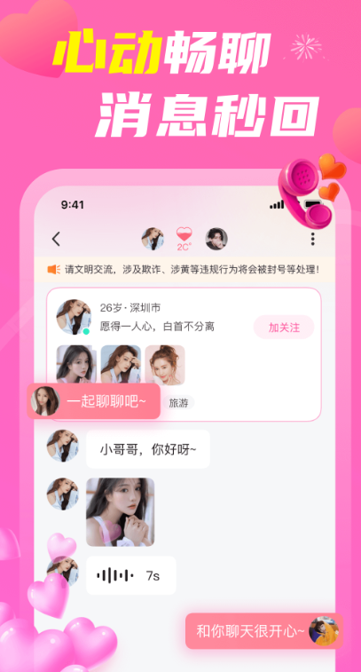 真实可靠的恋爱交友平台,匹配附近小伙伴,认识更多有趣对象,享受更贴心的聊天交友体验,附近聊天互动,认识新朋友,为用户带来更贴心的聊天交友体验。
