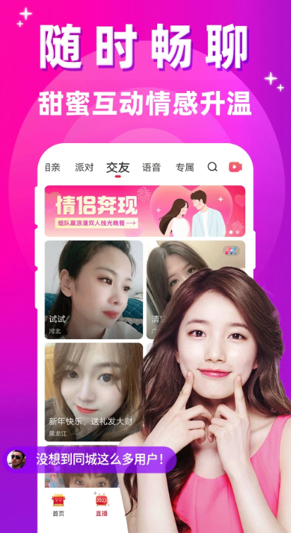 3、一键搭讪,快速开聊,附近陌生美女真人在线随时随地互动视频,与同城兴趣相投的女生畅聊真实交友恋爱。
