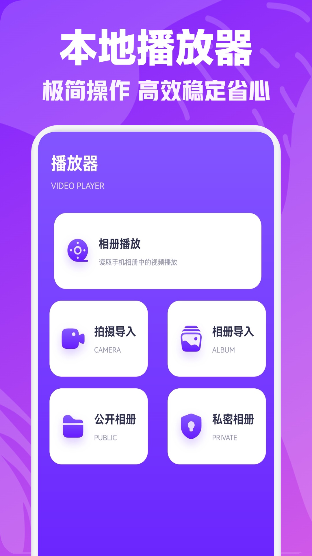 3、来到软件播放器页面可使用相册播放、拍摄导入、相册导入、公开相册等功能。