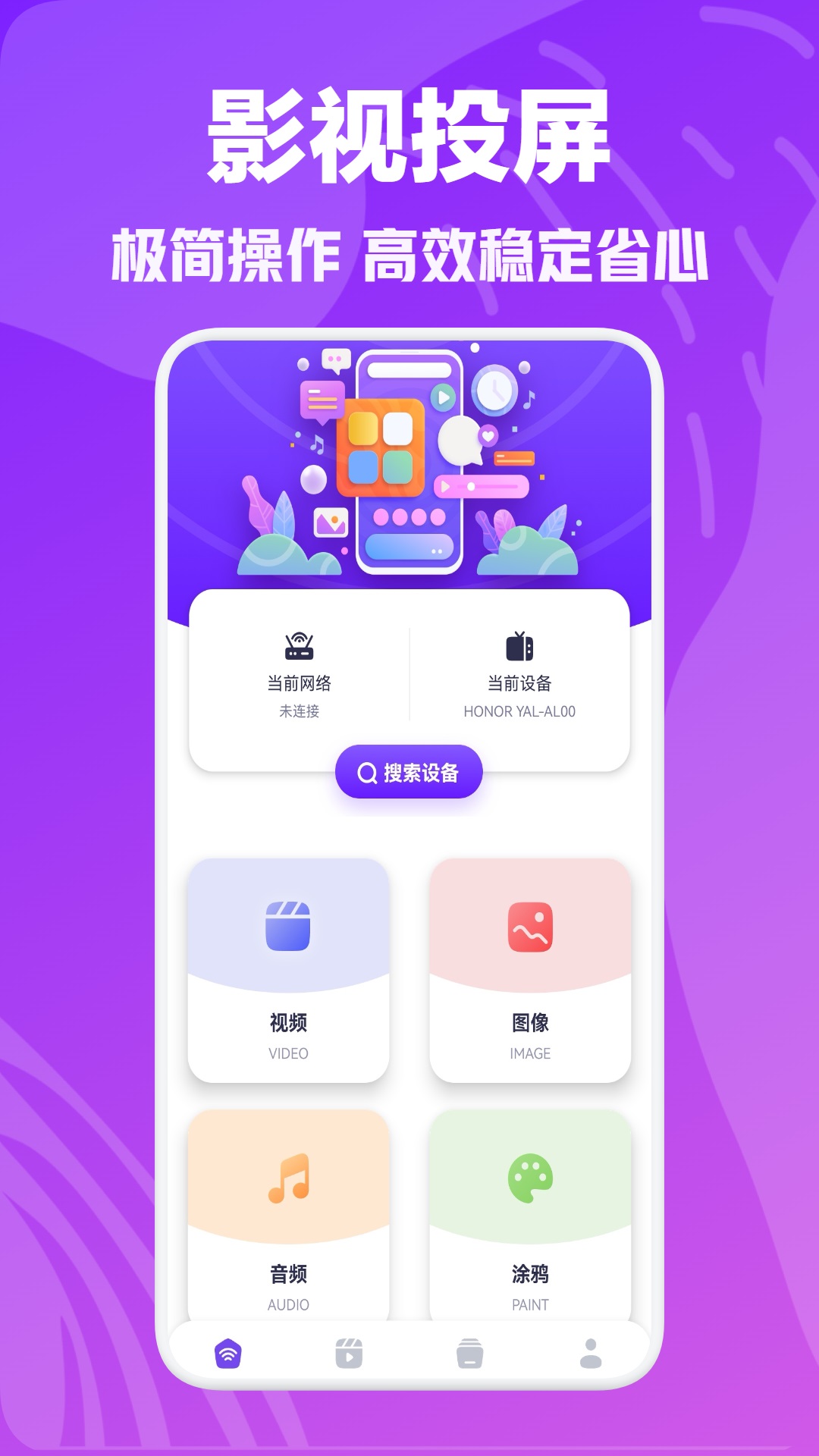 3、开始搜索投屏的设备,搜索完毕后,页面会显示自己的电视设备,直接点击即可进行连接;