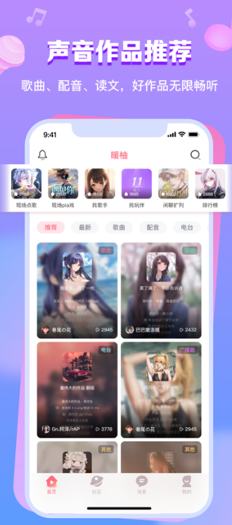 暖柚为众多声音爱好者提供了空间,在这里可以聆听到各类精彩的配音、闪亮的歌声等内容,时刻感受声音的温度和魅力。