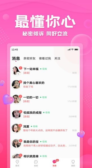 方便大家在聊天交友的同时结识志同道合的好友和情感伴侣,可以通过发起话题、加入小组、参加线下聚会等多种方式扩大自己的社交圈,满足不同场合的社交需求!