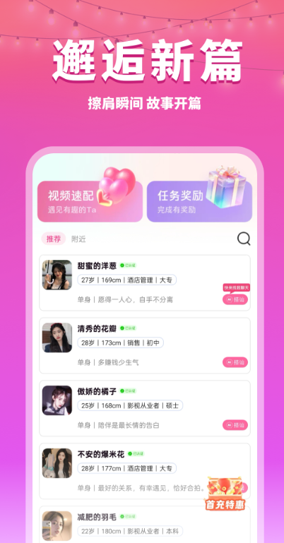 具备了目前主流交友应用的一些常见功能,如推荐好友、聊天互动等,致力于为用户寻找到真正符合自己需求的交友对象。