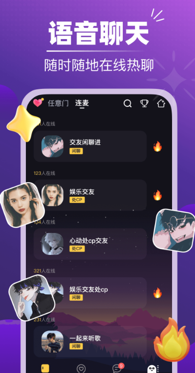 音聊视频聊天交友软件是一款免费体验的高端交友软件,可以实时建立语音连接,与陌生人交流心得。除了提供一对一语音互动,还有针对性的配对和群聊供用户选择。不同的聊天室内有着各自不同的主题和风格,满足不同类型人群的需求,随时和心动对象去沟通!