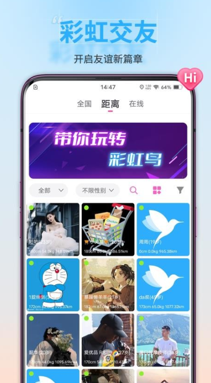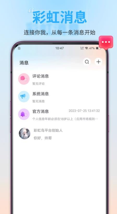 彩虹鸟交友软件下载安装手机版苹果,这是一款优质的同城交友平台,汇聚附近高颜值小伙伴,享受更贴心的聊天交友服务,认识更多有趣对象,随时随地放心交友为用户带来更贴心的聊天交友服务,认识更多有趣的人。
