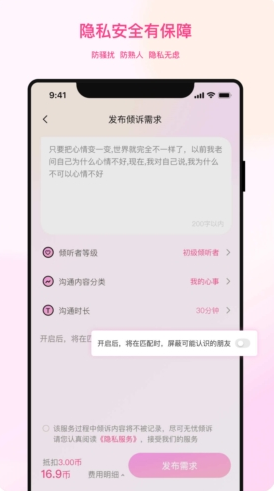 听昵专注于提供需求匹配的一对一的倾诉和倾听服务,有倾诉需求的你更值得随时被认真的对待和持续的呵护。