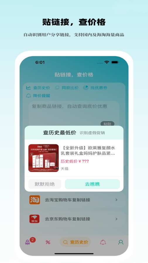 3、复制商品链接,可查询历史的商品价格,寻找内部隐藏优惠券。