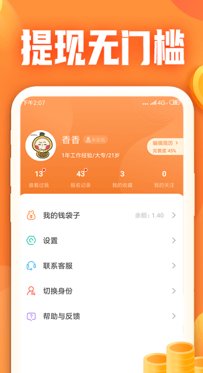 3、用户需要完善个人资料,并且可以快速进入兼职首页。