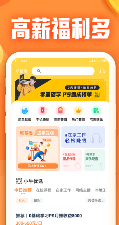1.小牛兼职不同于其他兼职类的软件,小牛兼职除了线下求职的相关岗位,还拥有居家办公等相关职位,方便宝妈在家也可以兼职。