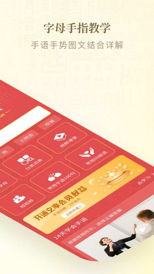 2、首页提供各种丰富的手语知识,拥有手指字母,视频课堂,常用问候语学习。