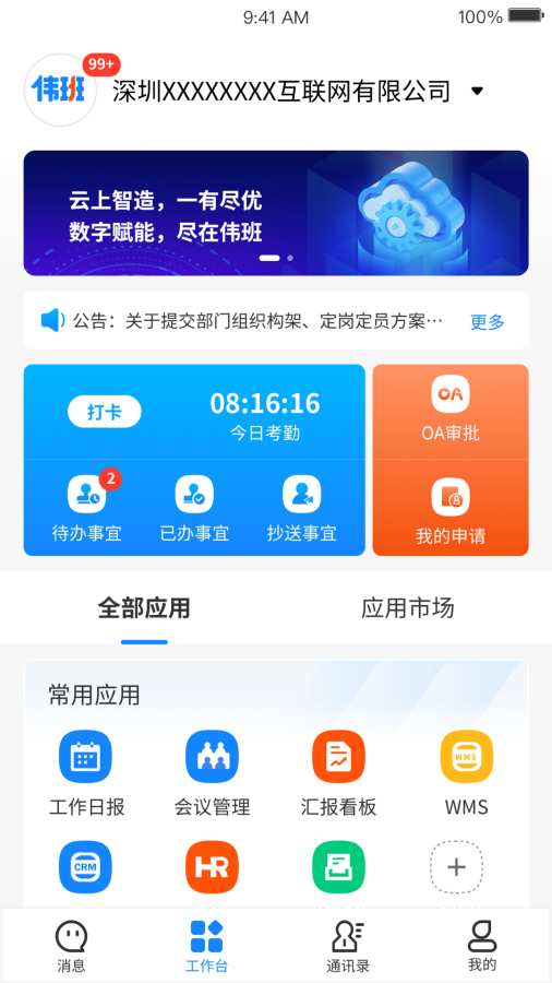 伟班APP是一款智能移动办公软件,公司企业可以使用这款软件达到公司管理信息化,一体化,能够将整体公司结构都完整地在软件中描绘出来,考勤打卡,在线会议等常用功能一应俱全,是办公效率提升的好软件,有需要的用户快来下载吧!