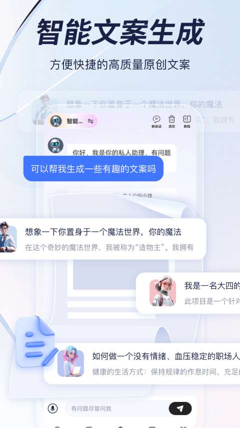 趣创作app是一款智能的写作软件,可以帮助你更加高效的完成各类文案的创作,你还可以通过聊天对话的形式激发出一些创作的灵感,软件功能类型多样有推广文案的创作、短视频的创作等等,让你办公的效率事半功倍,喜欢的朋友们快点来下载吧!