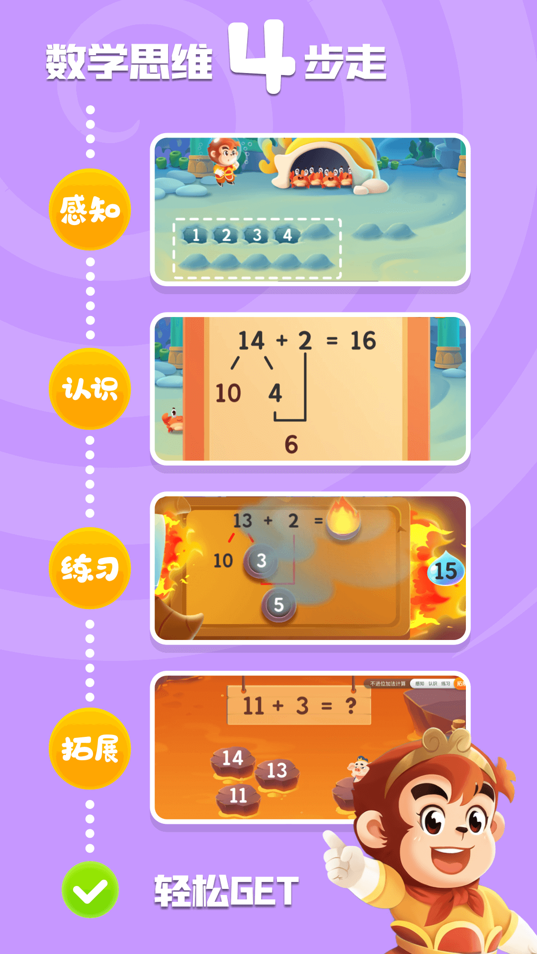 悟空数学是针对幼儿思维逻辑锻炼而开发的产品。产品包含空间、时间、分类、规律、以及数和运算能力等几大模块的内容。设置26个学习单元,每一个单元包含一个相关的启蒙故事,通过故事建立孩子对学习概念的欲认知。然后进行思维训练游戏,每一个游戏精心设计有趣合理场景小故事,帮助孩子理解题目场景与题意,摆脱枯燥的单纯做题目,提高解决问题能力。产品单元设计由浅入深,根据孩子的年龄和认知程度进行划分。