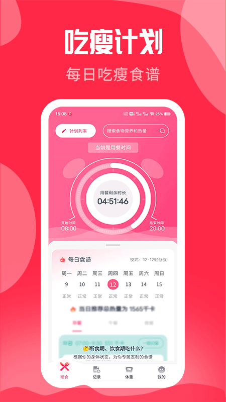 吃瘦计划app里面提供多种减肥的方案,帮助用户合理有效的制定健康食谱,让用户即便在不节食的情况下也能够轻松减肥,并且里面还提供很多健康的食谱,摄入量更加的可控,需要的朋友们快点来了解一下吧!