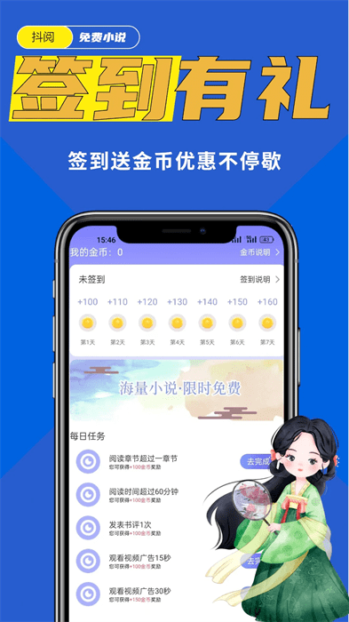 在线签到打卡完成各种阅读任务领取相关的金币,获取更多的福利资源;